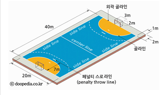 방어선을 넓히고 득점 기회를 만드는 역할을 합니다 핸드볼. 경기장 바깥 부분에 사이드라인을 따라 1m, 외곽 골라인 뒤편에 2m 이상의 안전지역을 확보하여야 한다.
